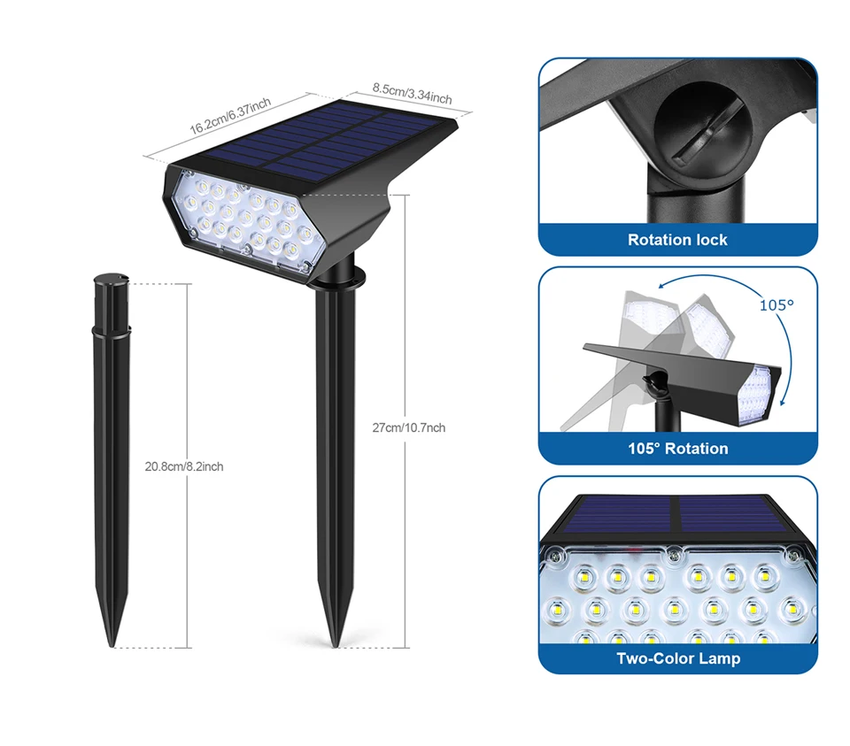 Meta description (SEO) Spot solaire LED 19 LEDs IP65 avec capteur crépusculaire, 2 modes d’éclairage et montage sol/mural. Blanc, blanc chaud, RGB ou 3 couleurs changeantes. Idéal pour jardin, allée et paysage.